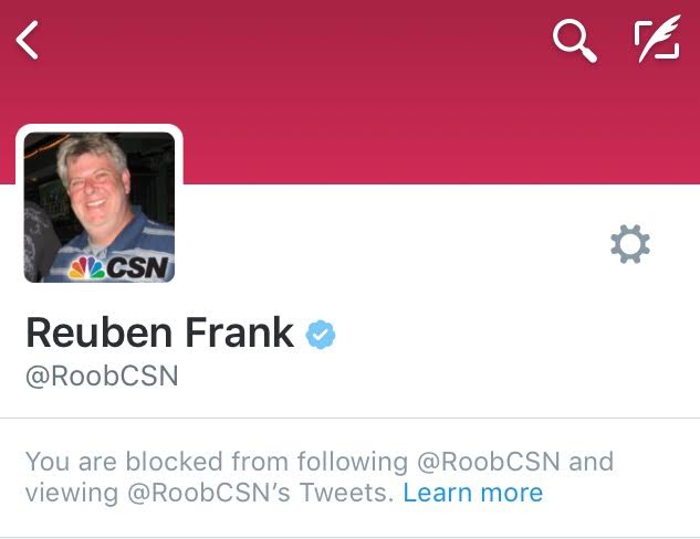 The Guinness Book of World Records will be honoring Rueben Frank of Comcast Sportsnet for being the first person to actually block an entire fanbase from following him on twitter. Many had speculated that Brandon Graham of the Philadelphia Eagles or even Greg Hardy of Never Getting An NFL Job Again would beat Rueben to the the punch but he proved the best in the game. When attempting to reach Rueben for a comment on the honor this reporter was hit with the block completing the impressive campaign. Rueben congratulations on the honor and good luck trying to get anyone to read your work when you have everyone blocked.